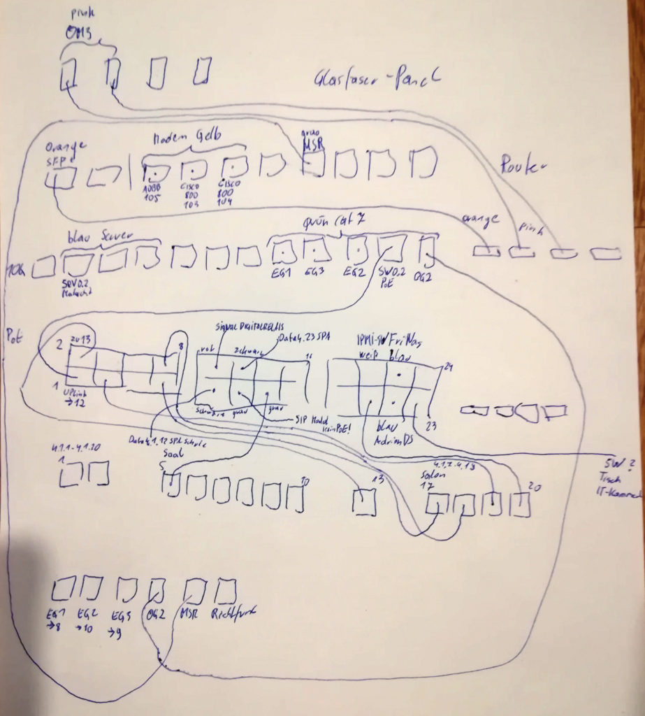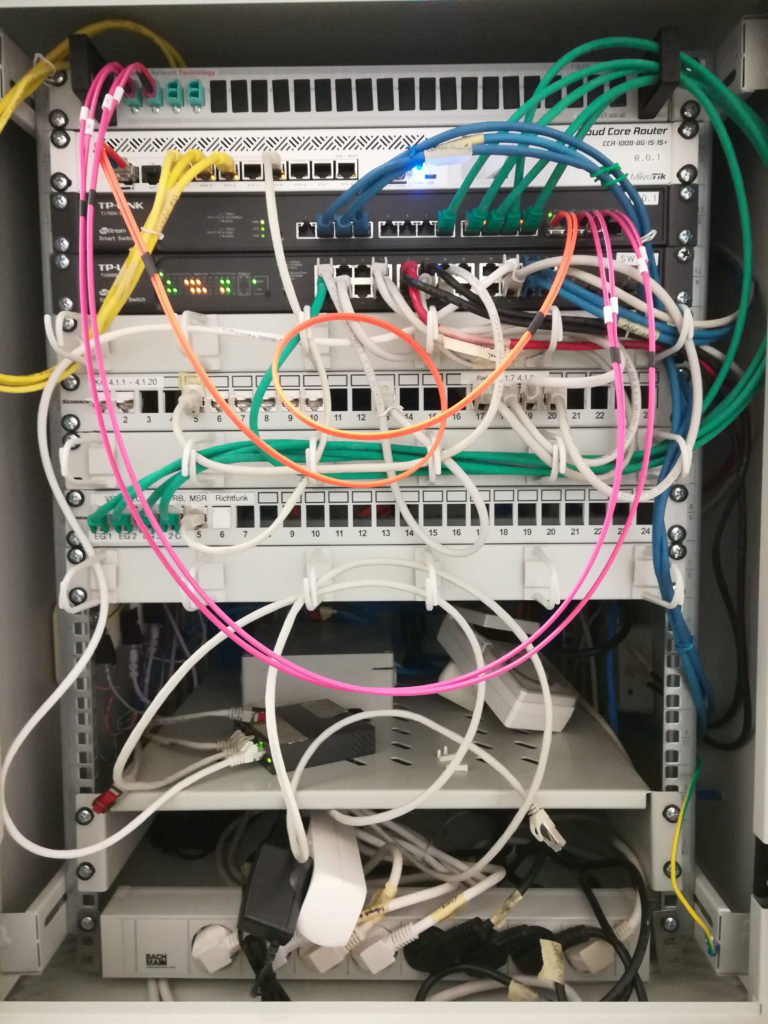 Im Dezember 2018 habe ich einen weiteren Switch gekauft und dutzende neue farbige Kabel, um Ordnung in diesem Netzwerkschrank zu machen. Die folgende Konfiguration bezieht sich also nicht auf den Stand nach Baufertigstellung, sondern nach dieser Neuverkabelung.