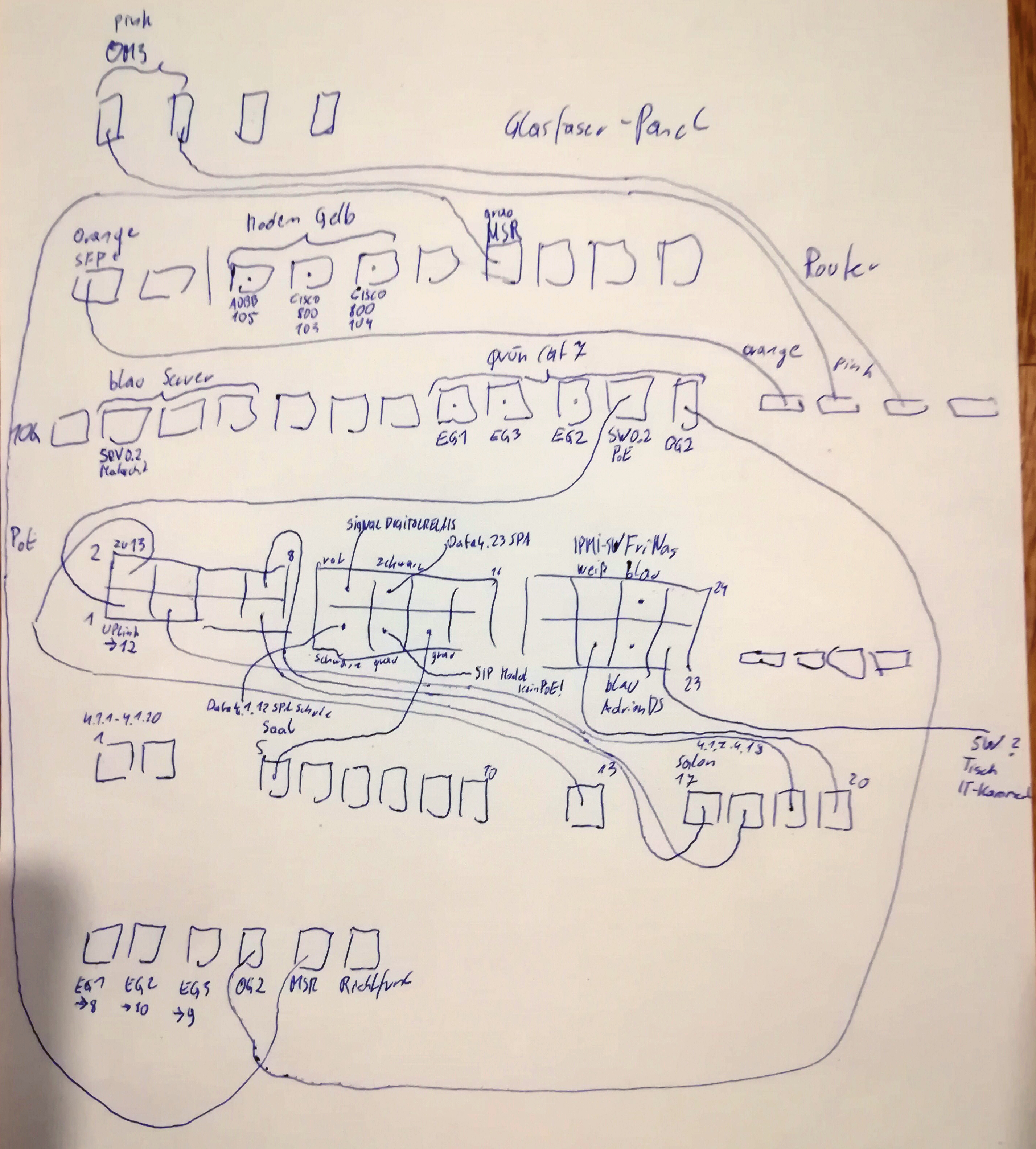 Quasi alle aus dem Netzwerkschrank herausführenden Datenkabel dienen der Versorgung der Geschoße OG1 bis DG2. Einzige Ausnahme bilden die 4 Glasfaserkabel und ein Kupferkabel, die ins KG zum Core-Switch 0.1 gehen. Genaueres siehe bei den Patch-Panels.